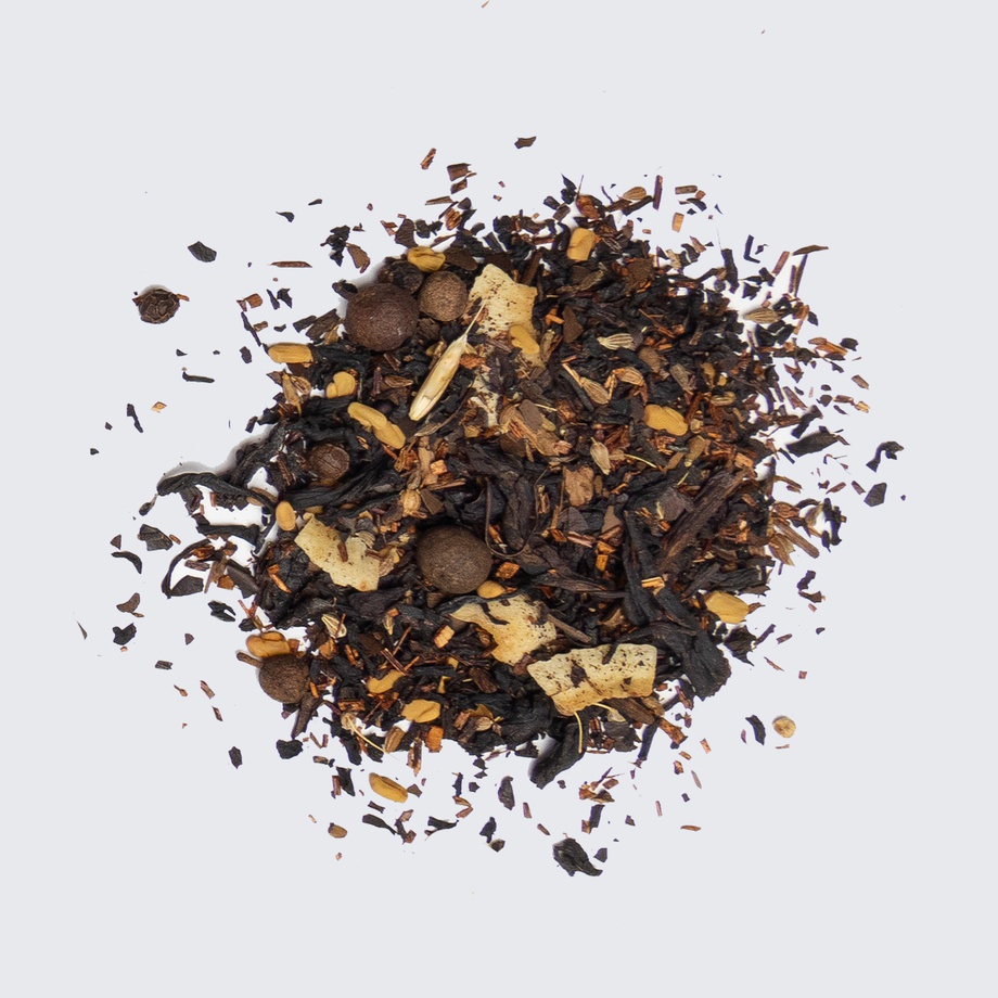 Black tea, roasted mate, rooibos, coconut chips, anise seeds, coconut chai extract, maca, black pepper, cinnamon, chaga, fenugreek, allspice.